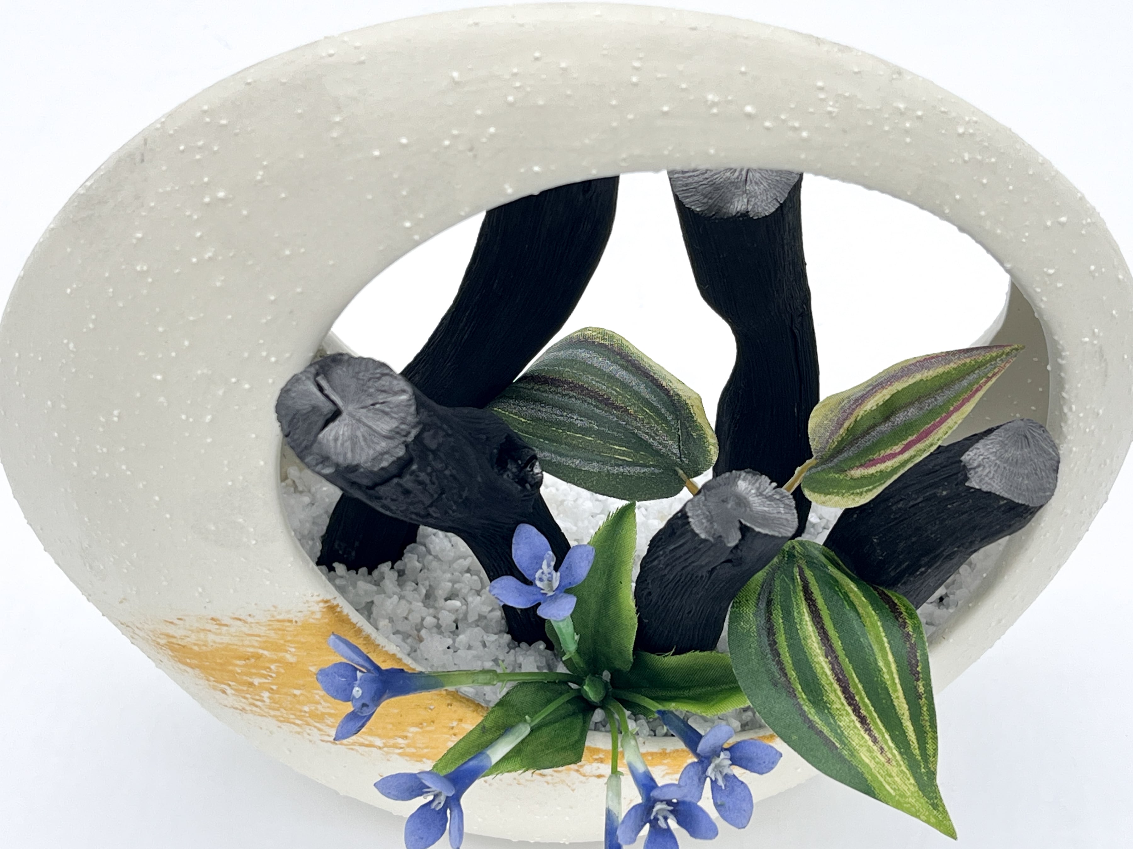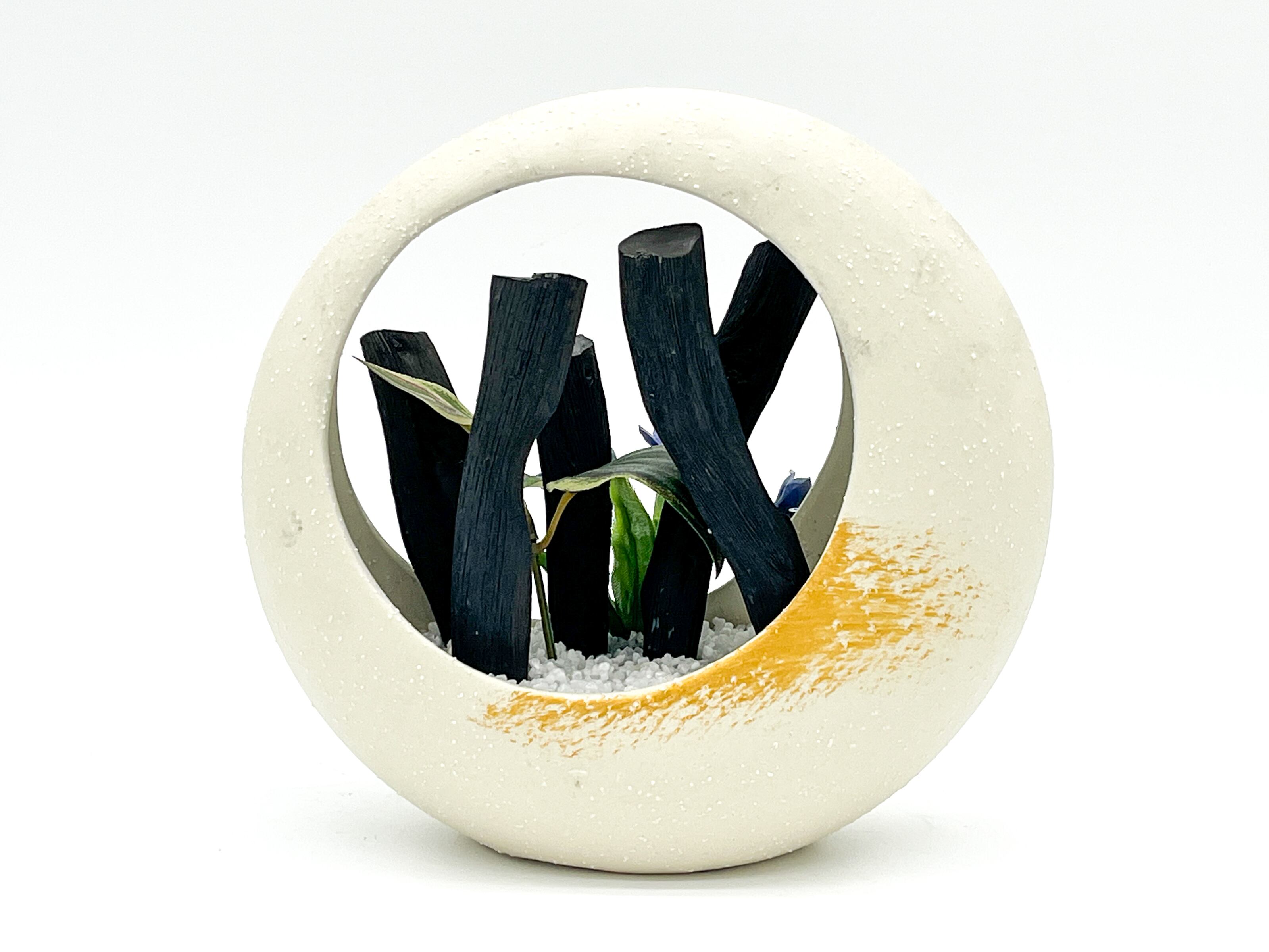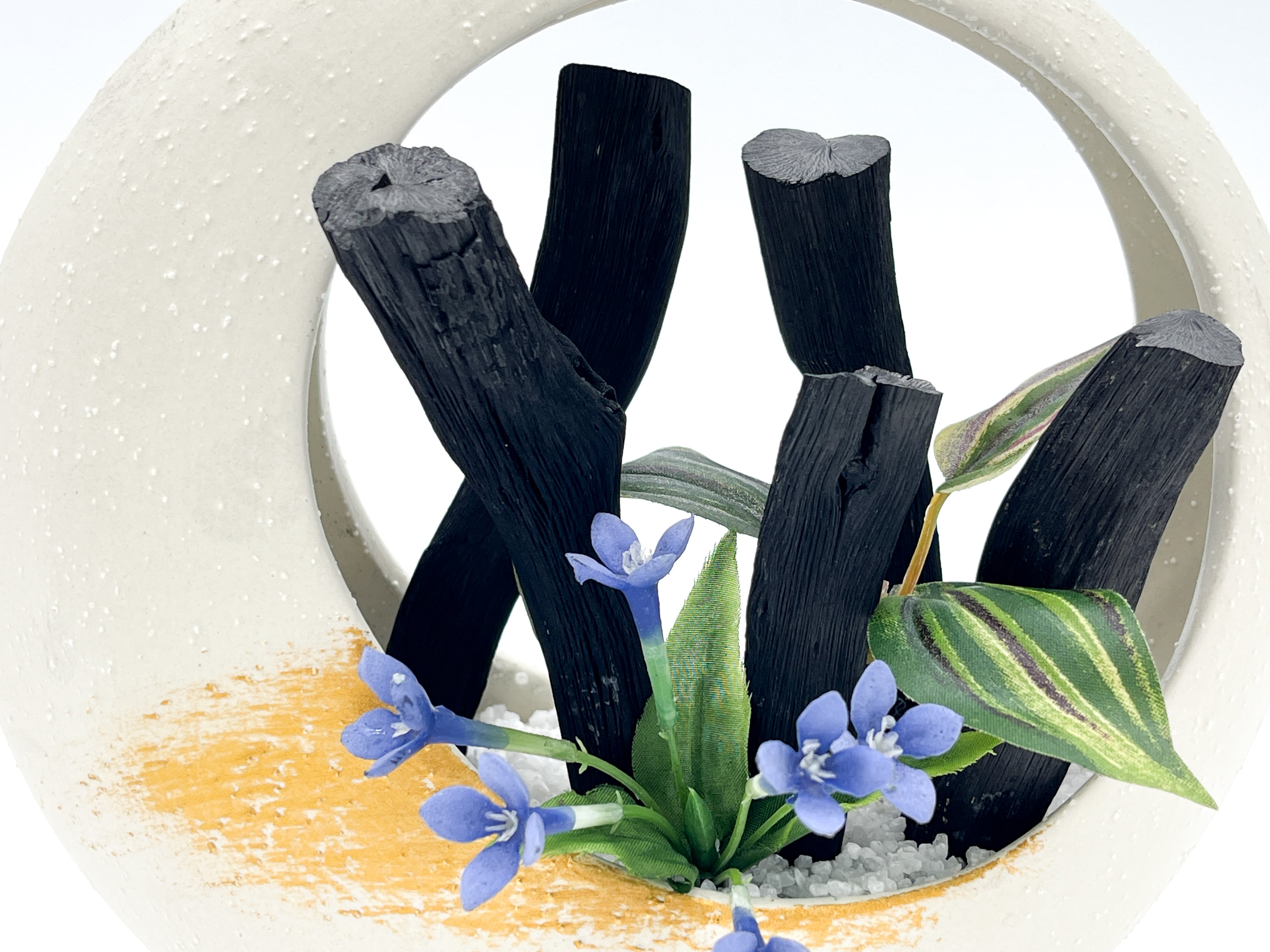 ・器はストーンウェアで、紀州備長炭と造花で出来ており、寒水砂を敷いています。