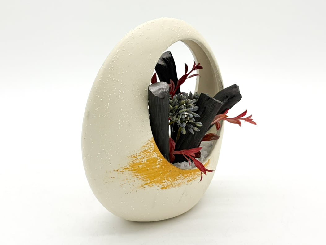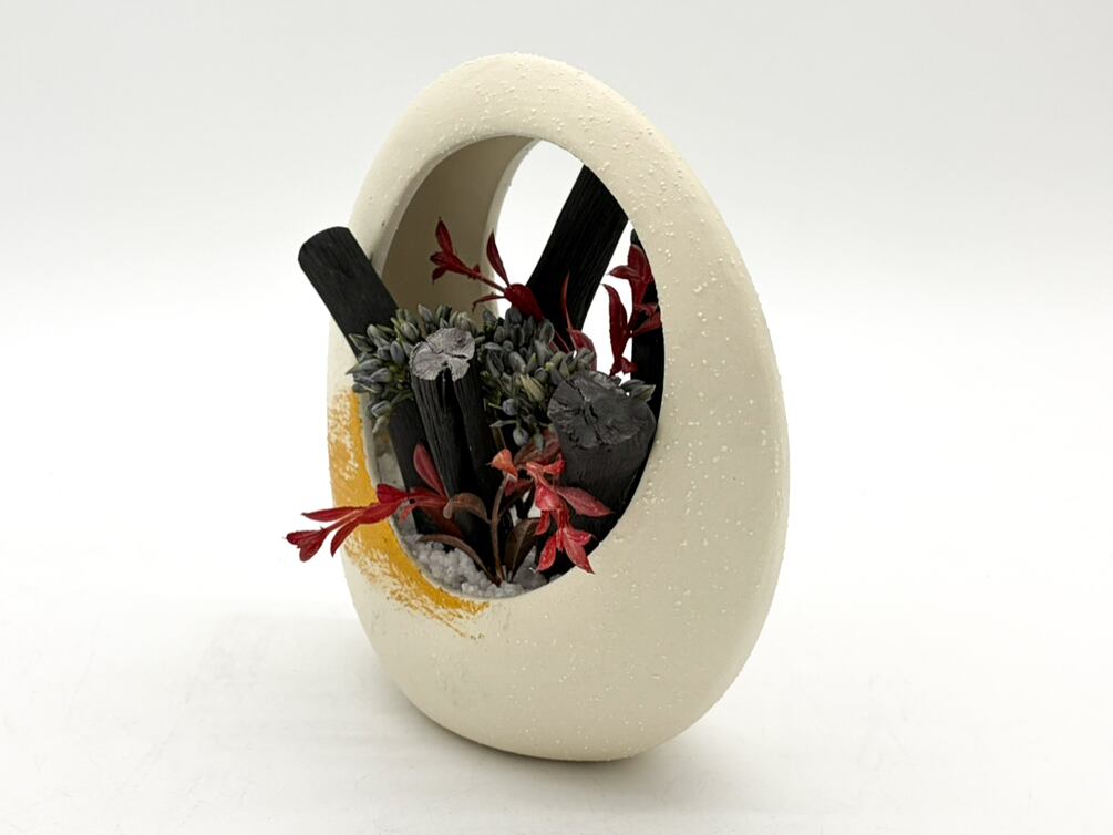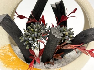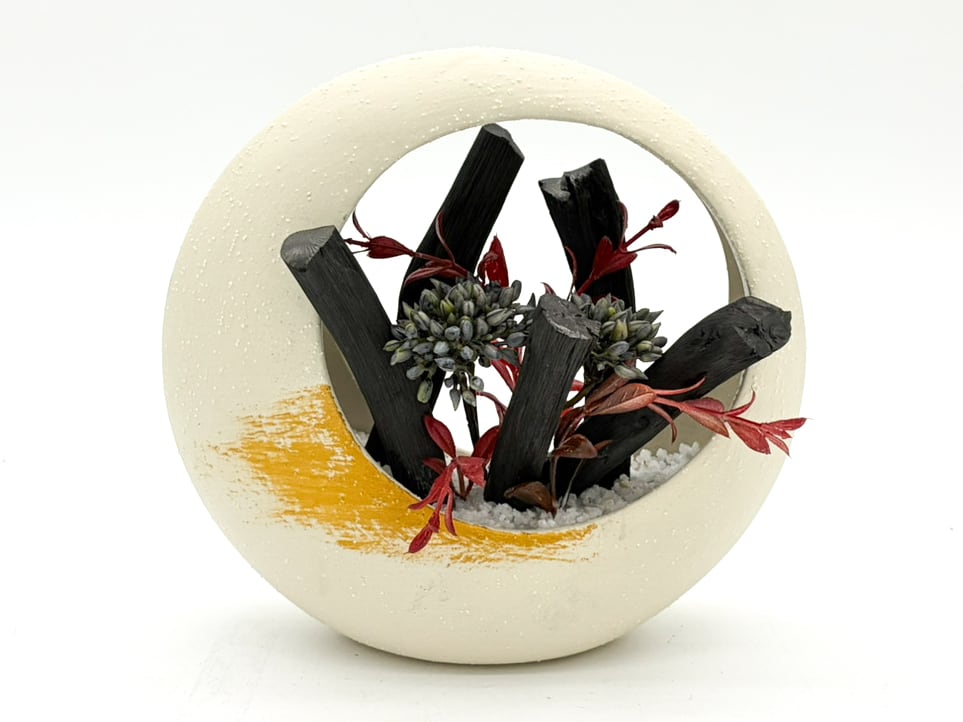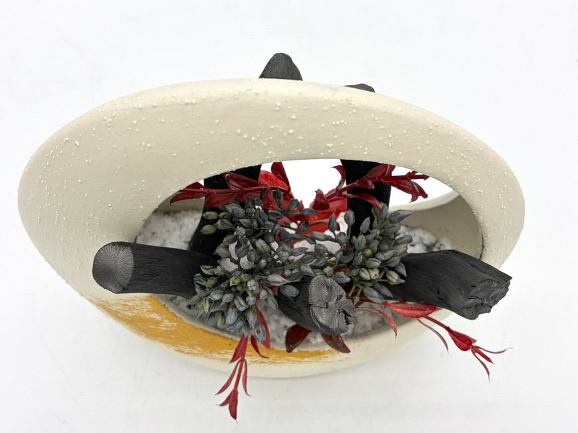 ・器はストーンウェアで、紀州備長炭と造花で出来ており、寒水砂を敷いています。