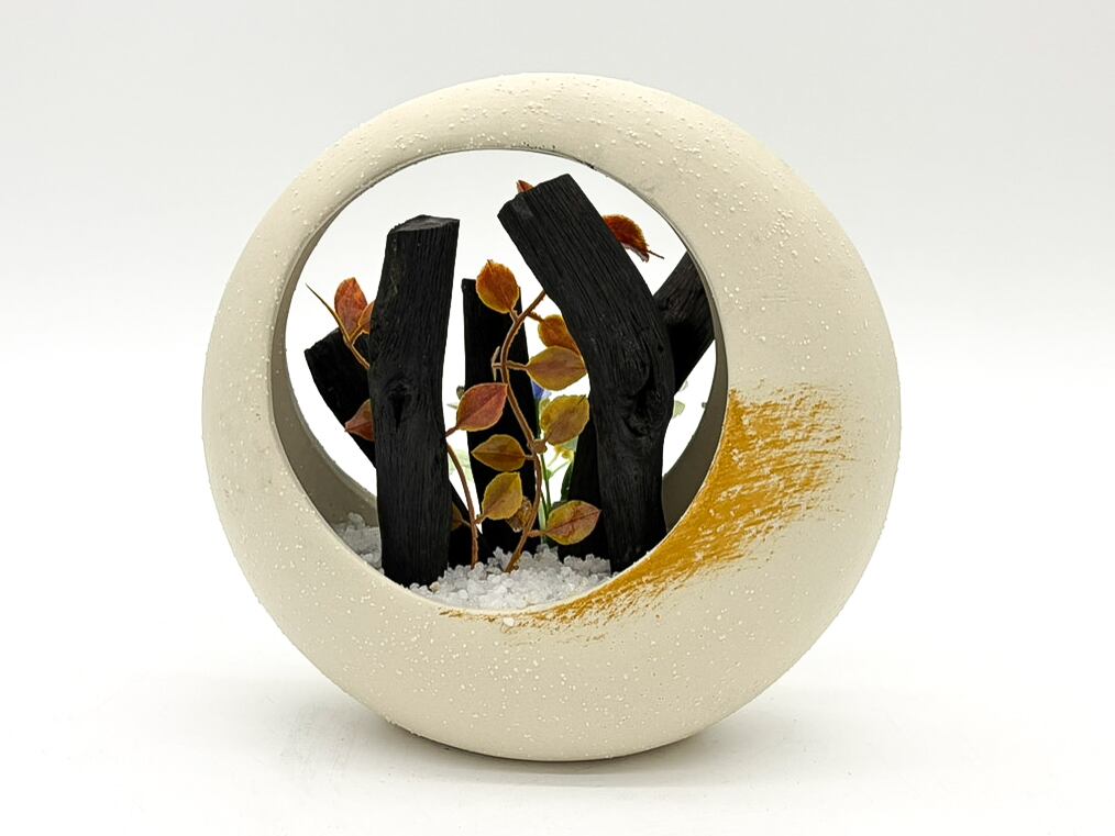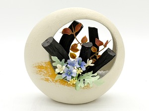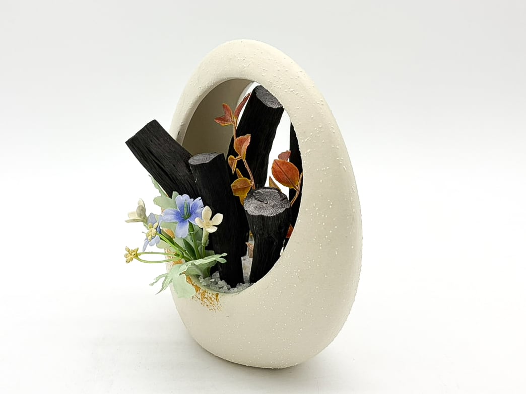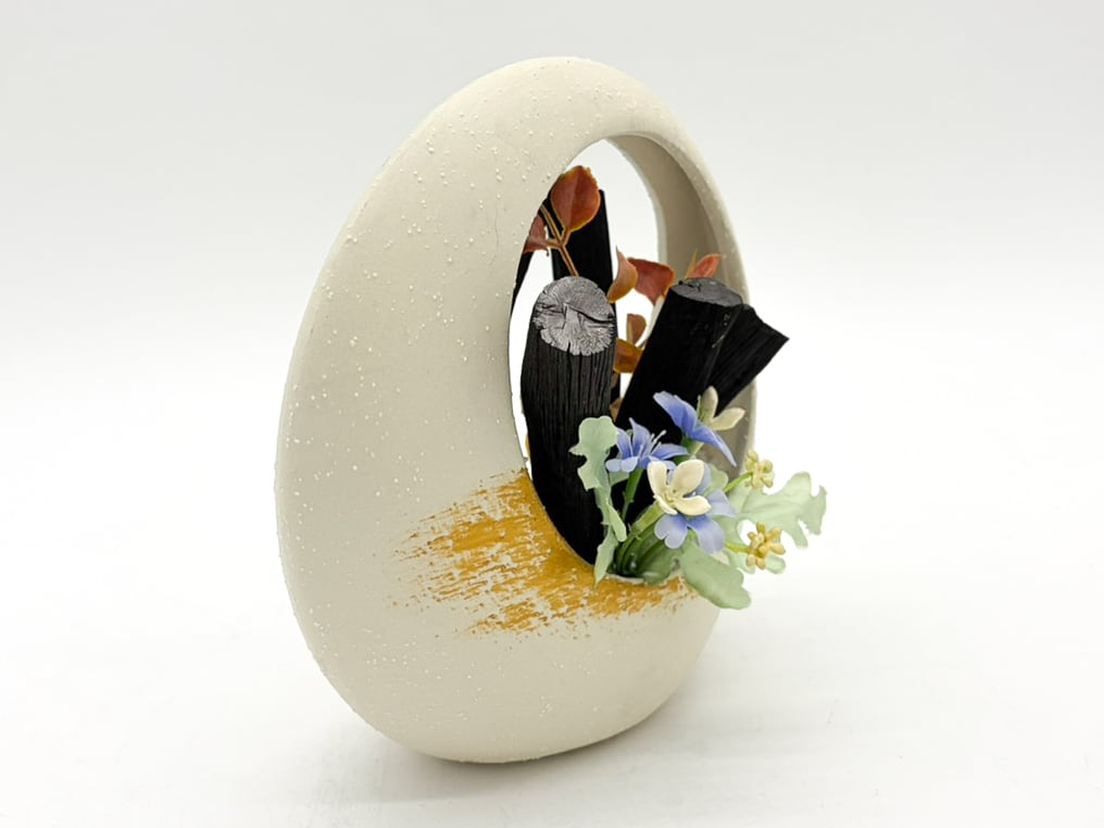 ・器はストーンウェアで、紀州備長炭と造花で出来ており、寒水砂を敷いています。