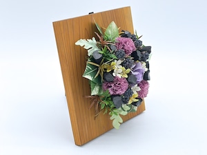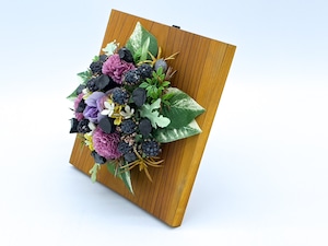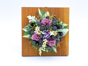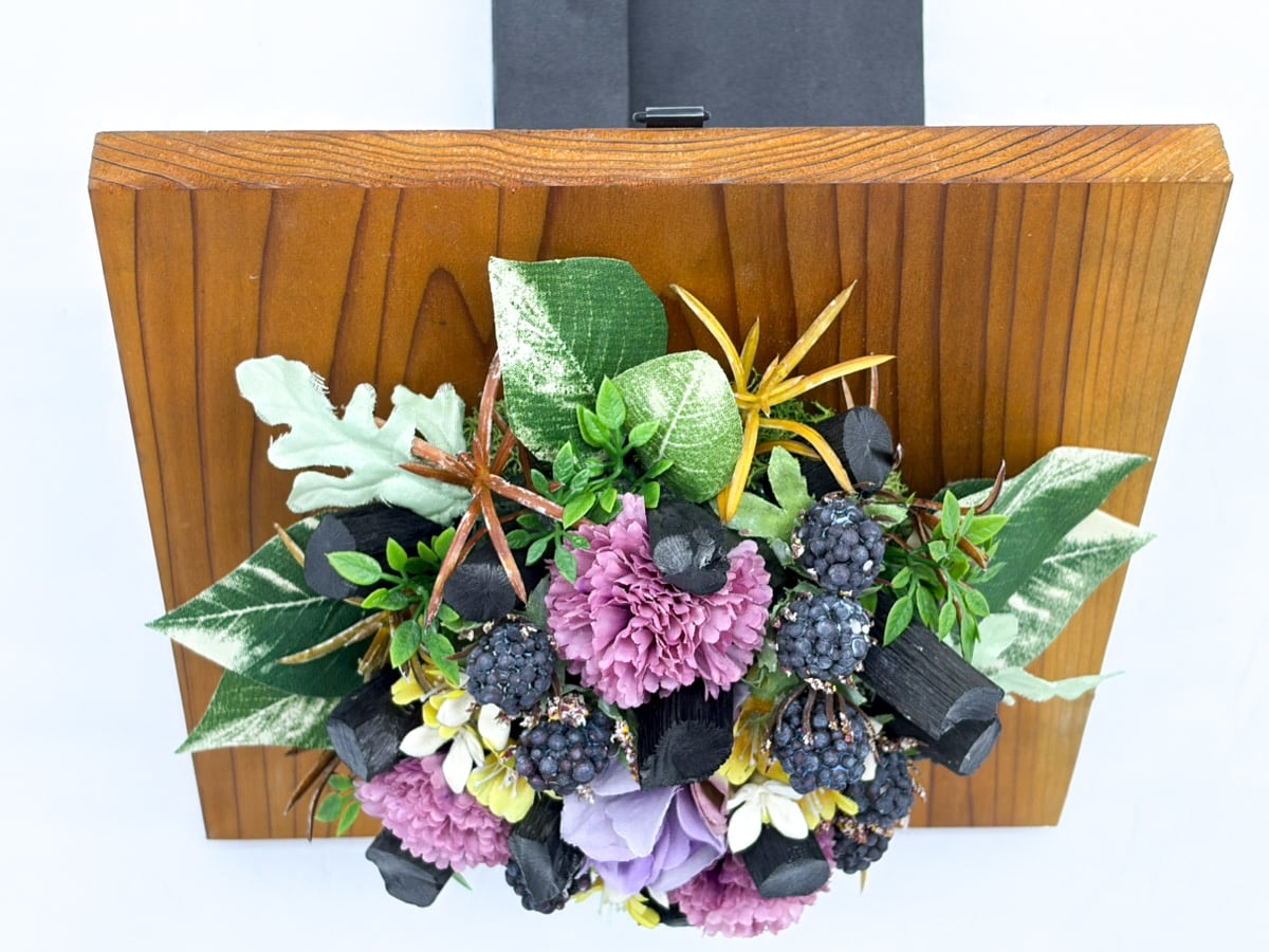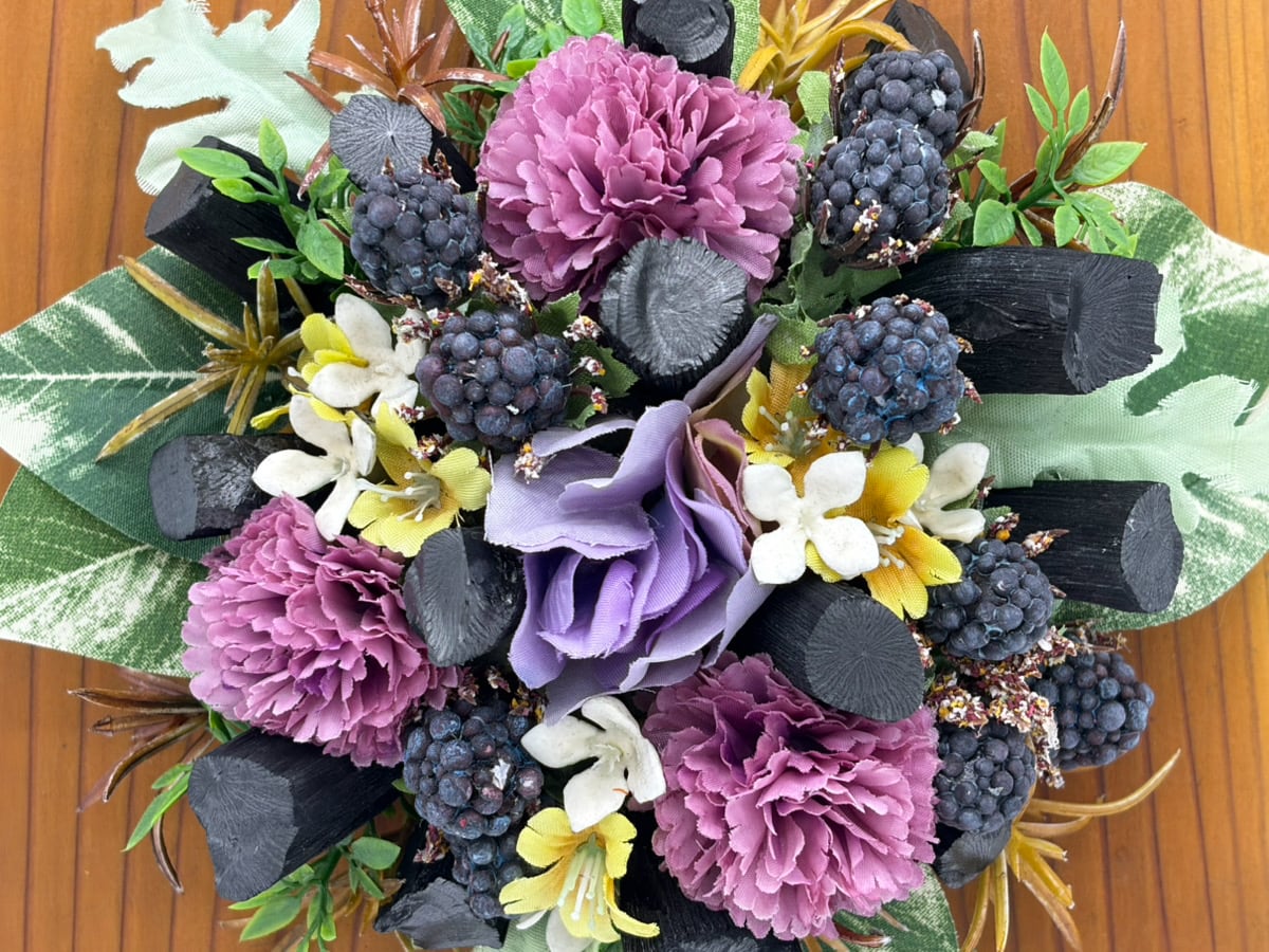 ・紀州備長炭と造花等でアレンジしています。
