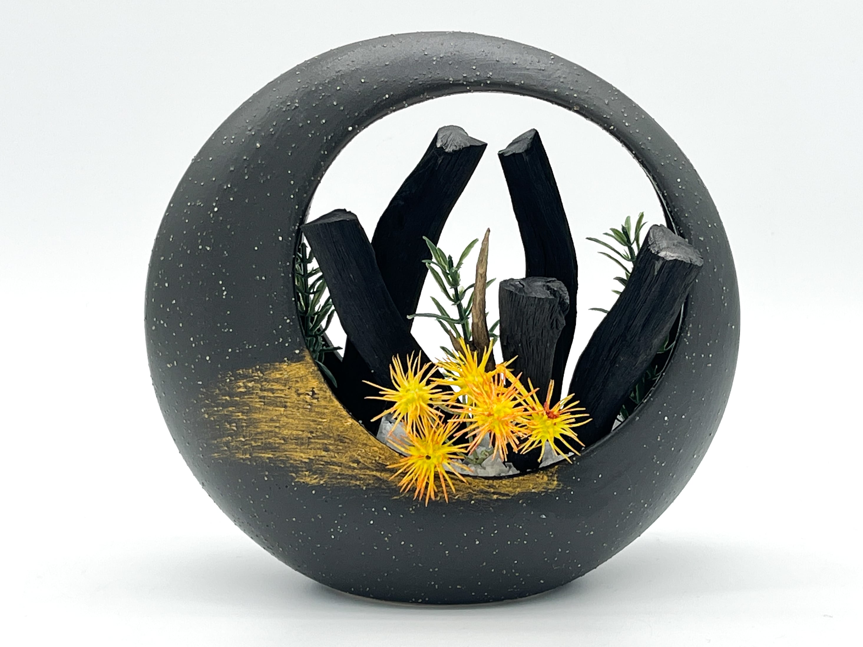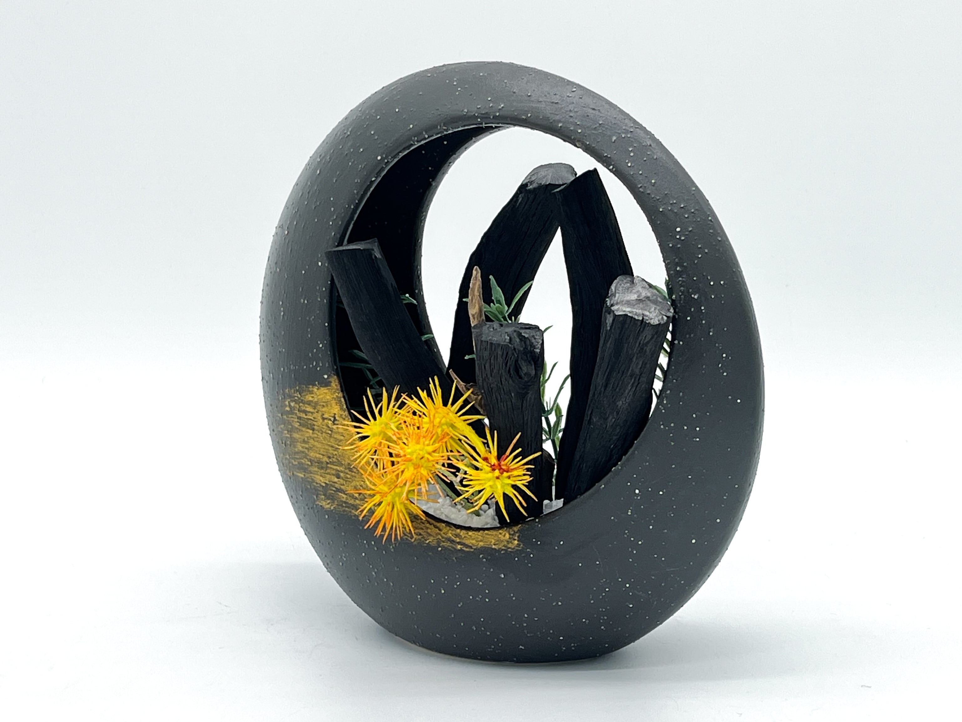 ・器はストーンウェアで、紀州備長炭に造花で出来ており、寒水砂を敷き詰めています。