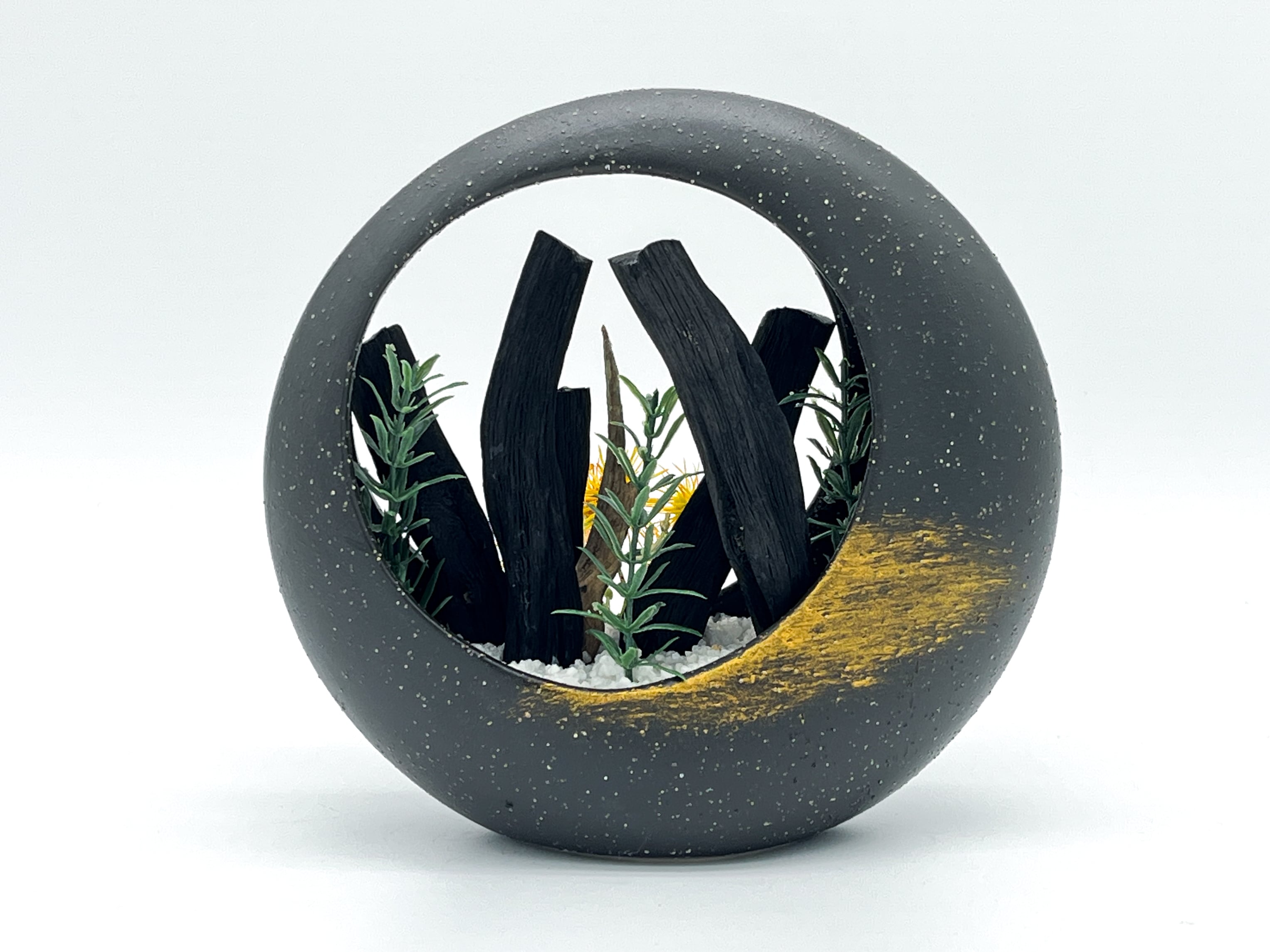 ・器はストーンウェアで、紀州備長炭と造花で出来ており、寒水砂を敷き詰めています。