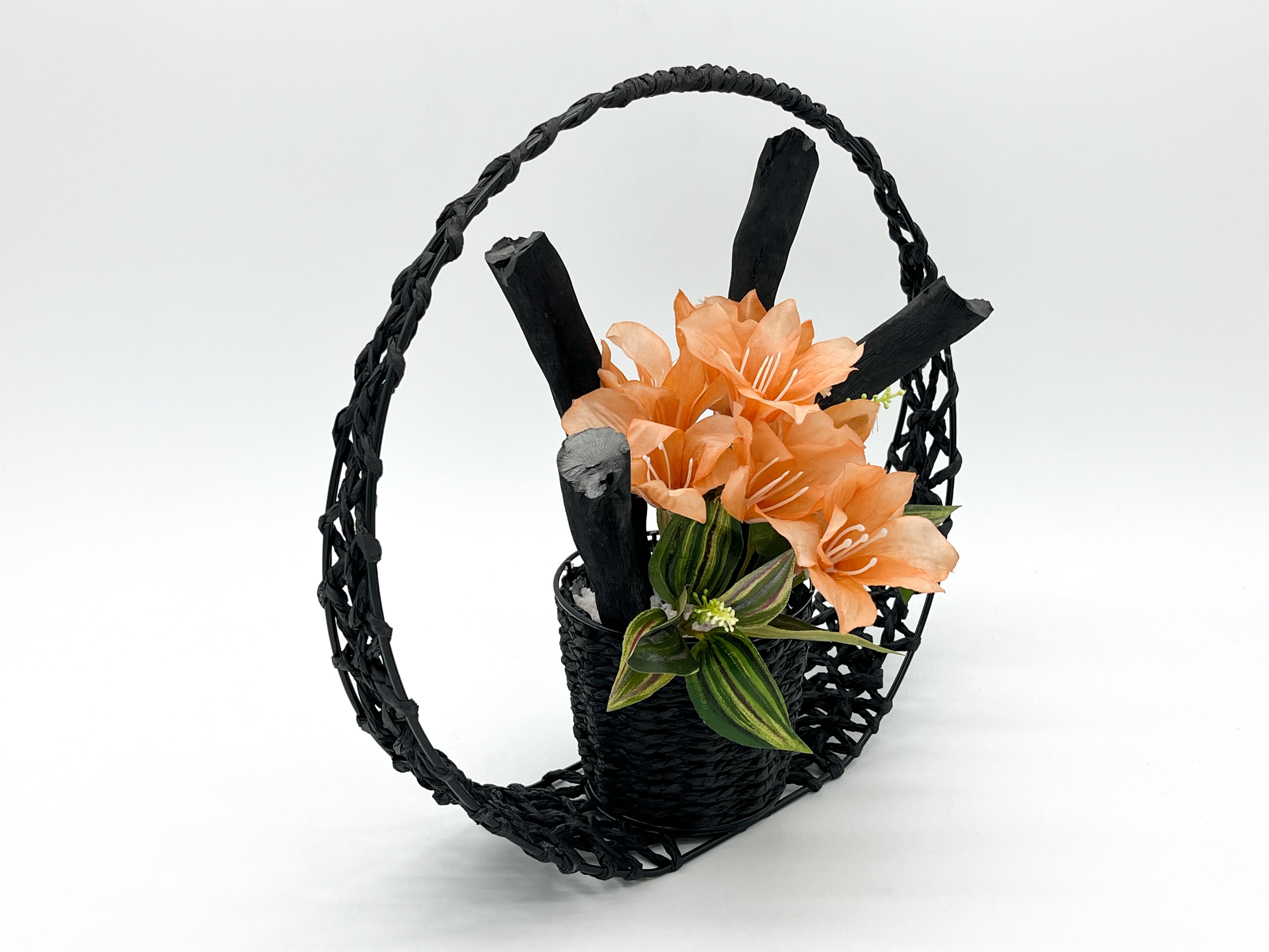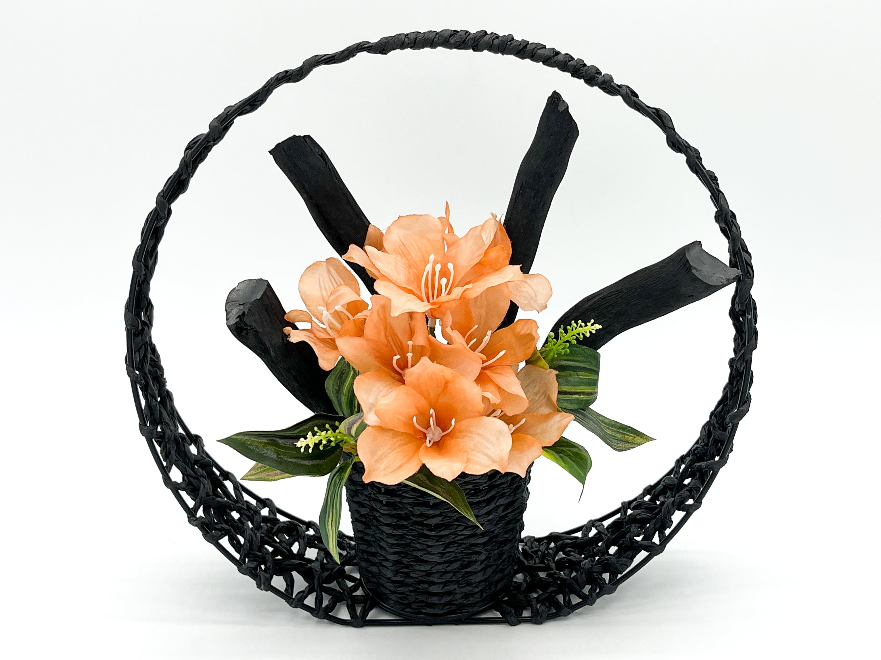 三日月や満月を思わせるような円の中に備長炭と花がアレンジされ、和モダンなスタイルを表現しています。
