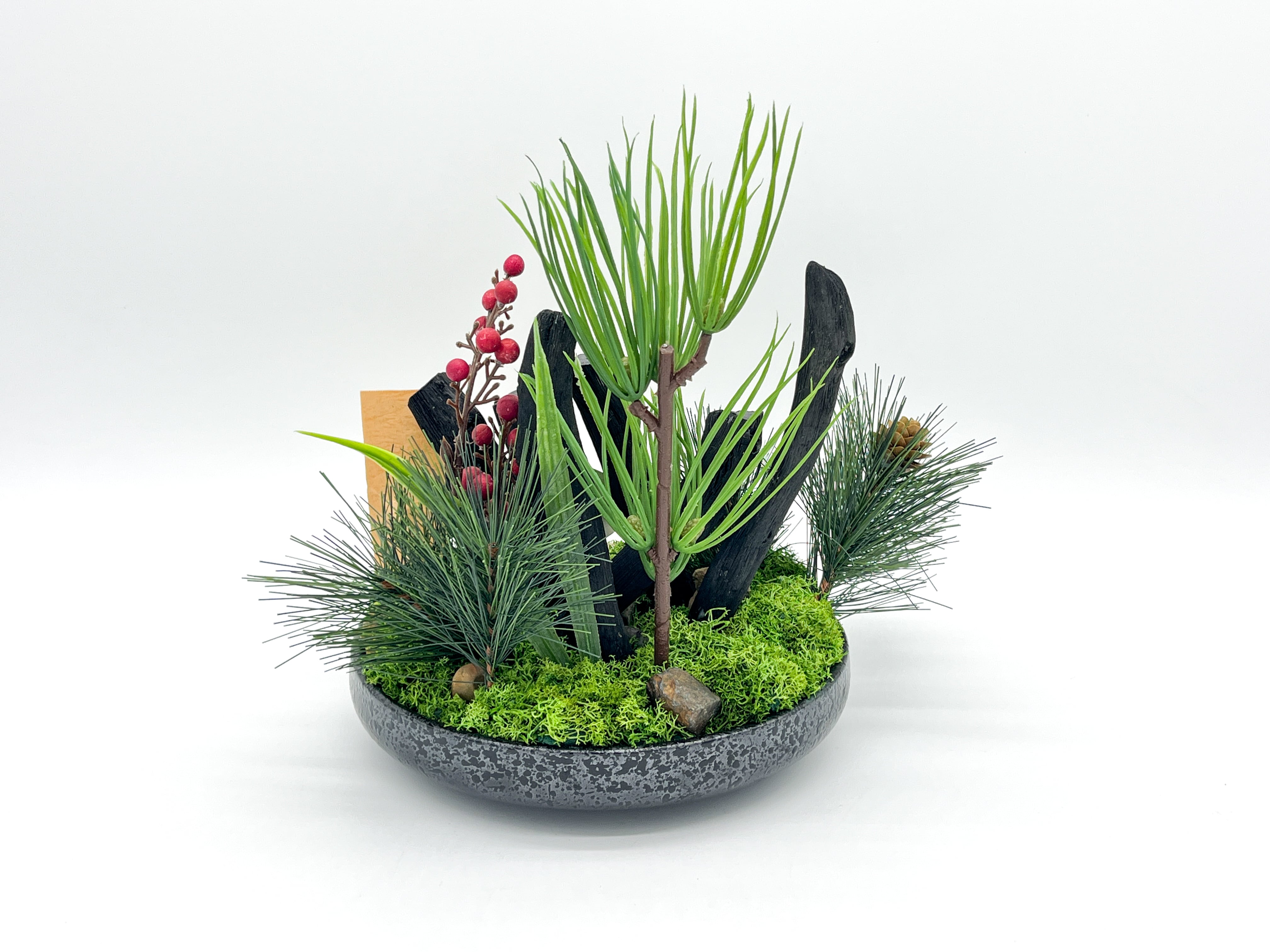 ・器は陶器で紀州備長炭と造花、プリザーブドモス等で出来ています。