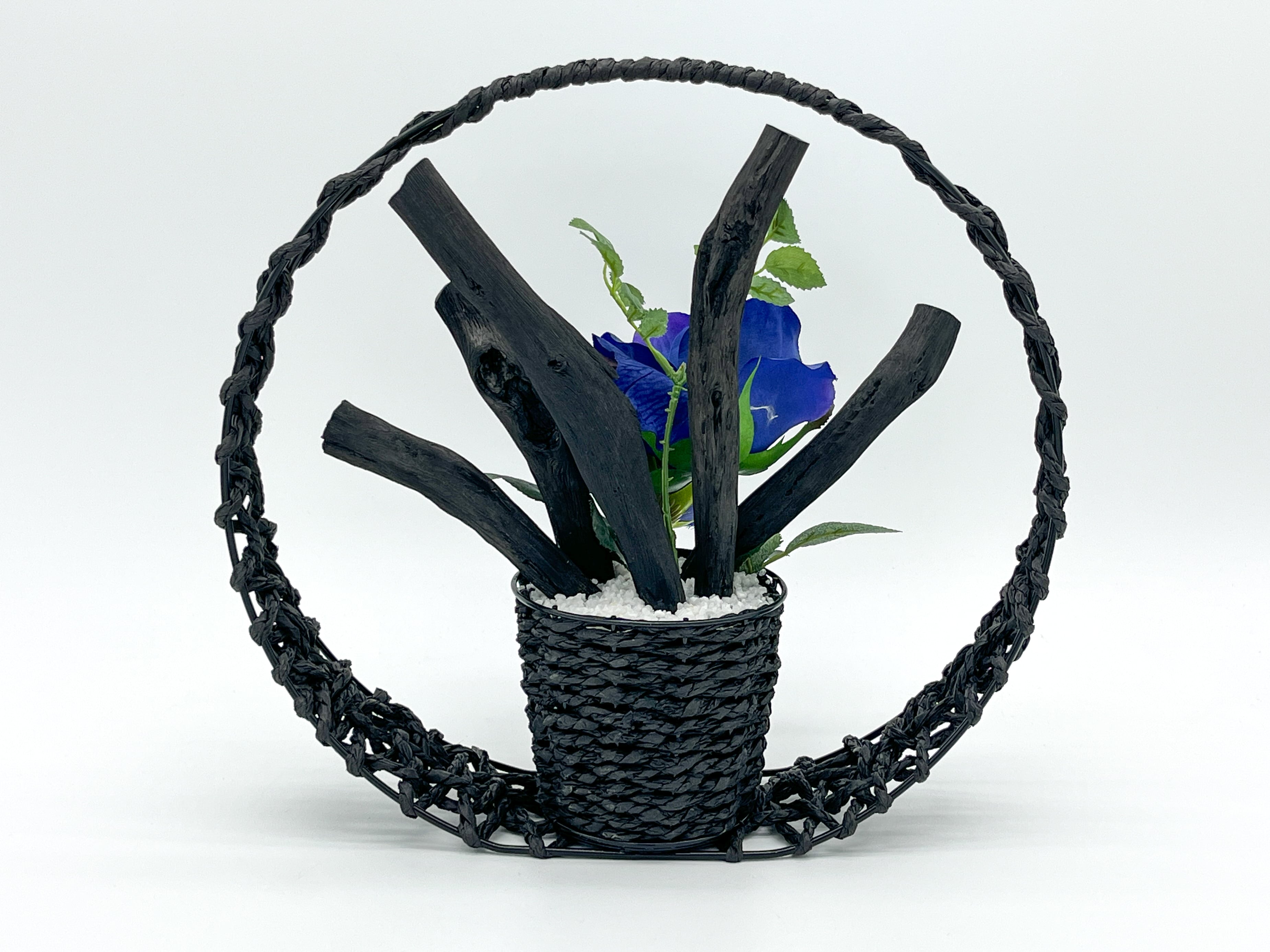 満月を思わせるような円の中に備長炭と造花の黒バラでアレンジされ、和モダンなスタイルを表現しています。