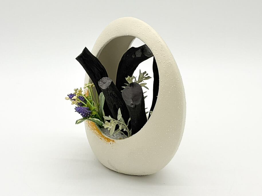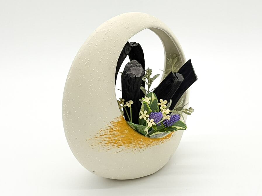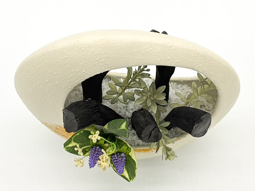 ・器はストーンウェアで、紀州備長炭と造花で出来ており、寒水砂を敷いています。