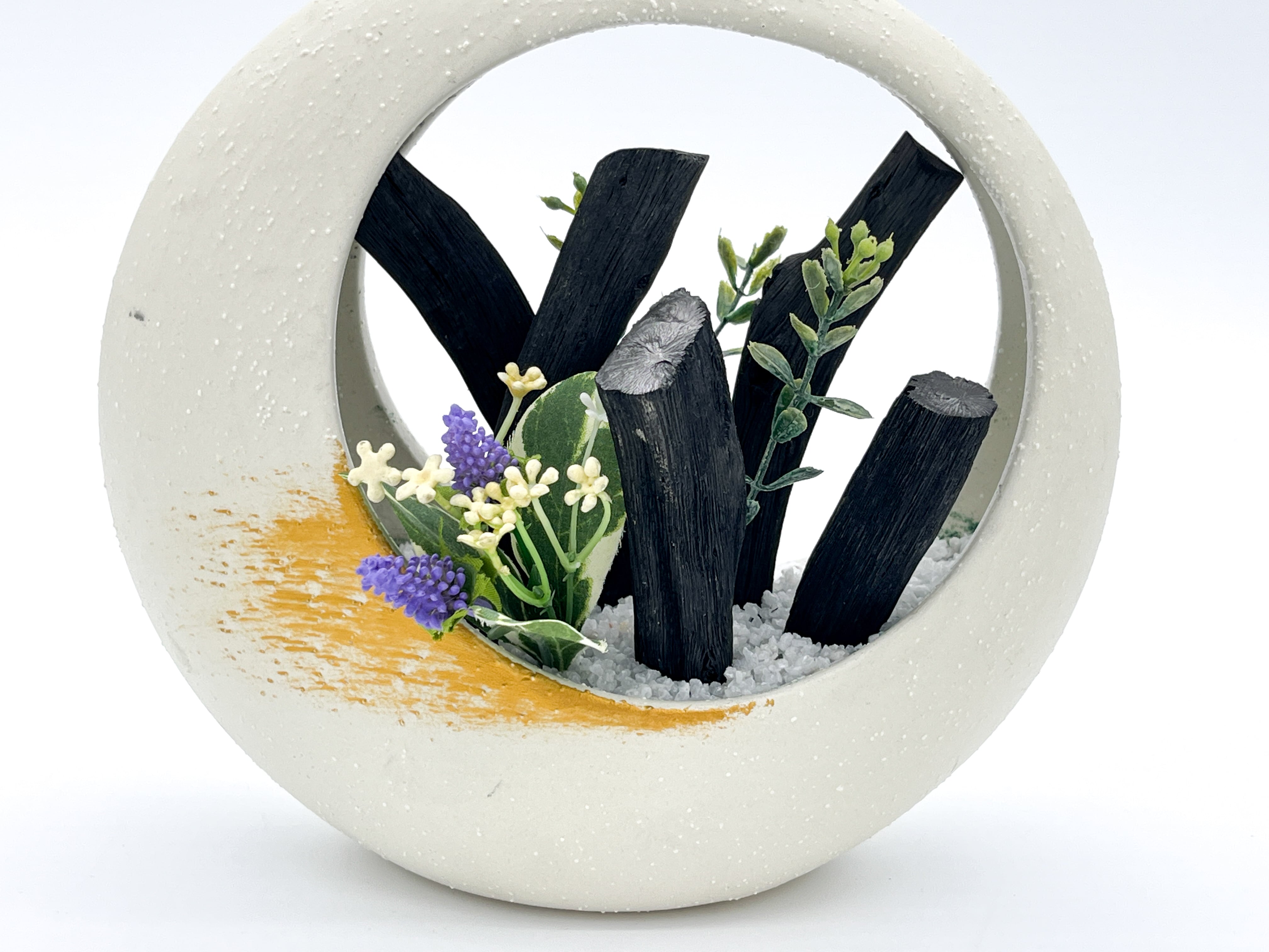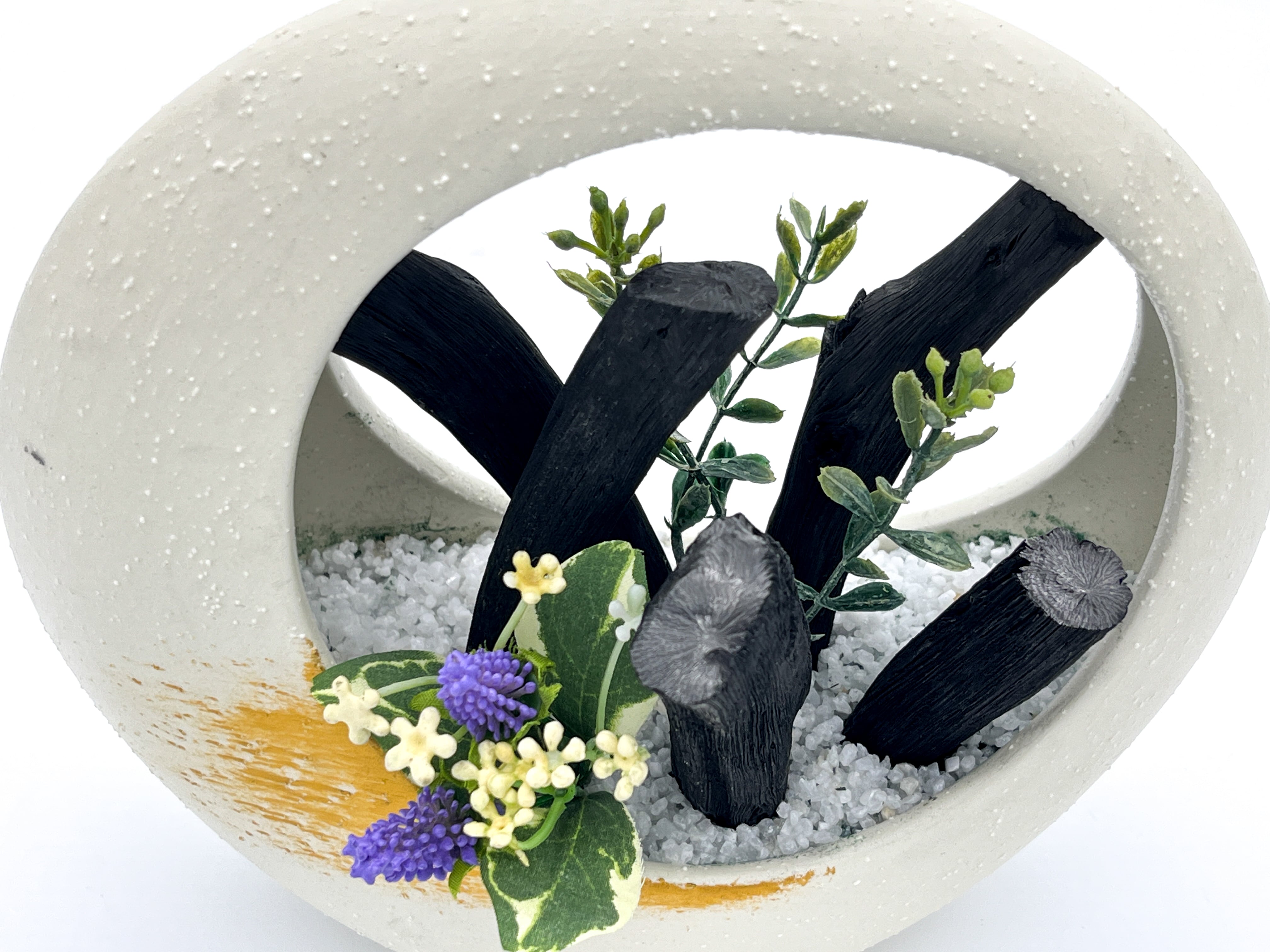 ・器はストーンウェアで、紀州備長炭に造花で出来ており、寒水砂を敷いています。